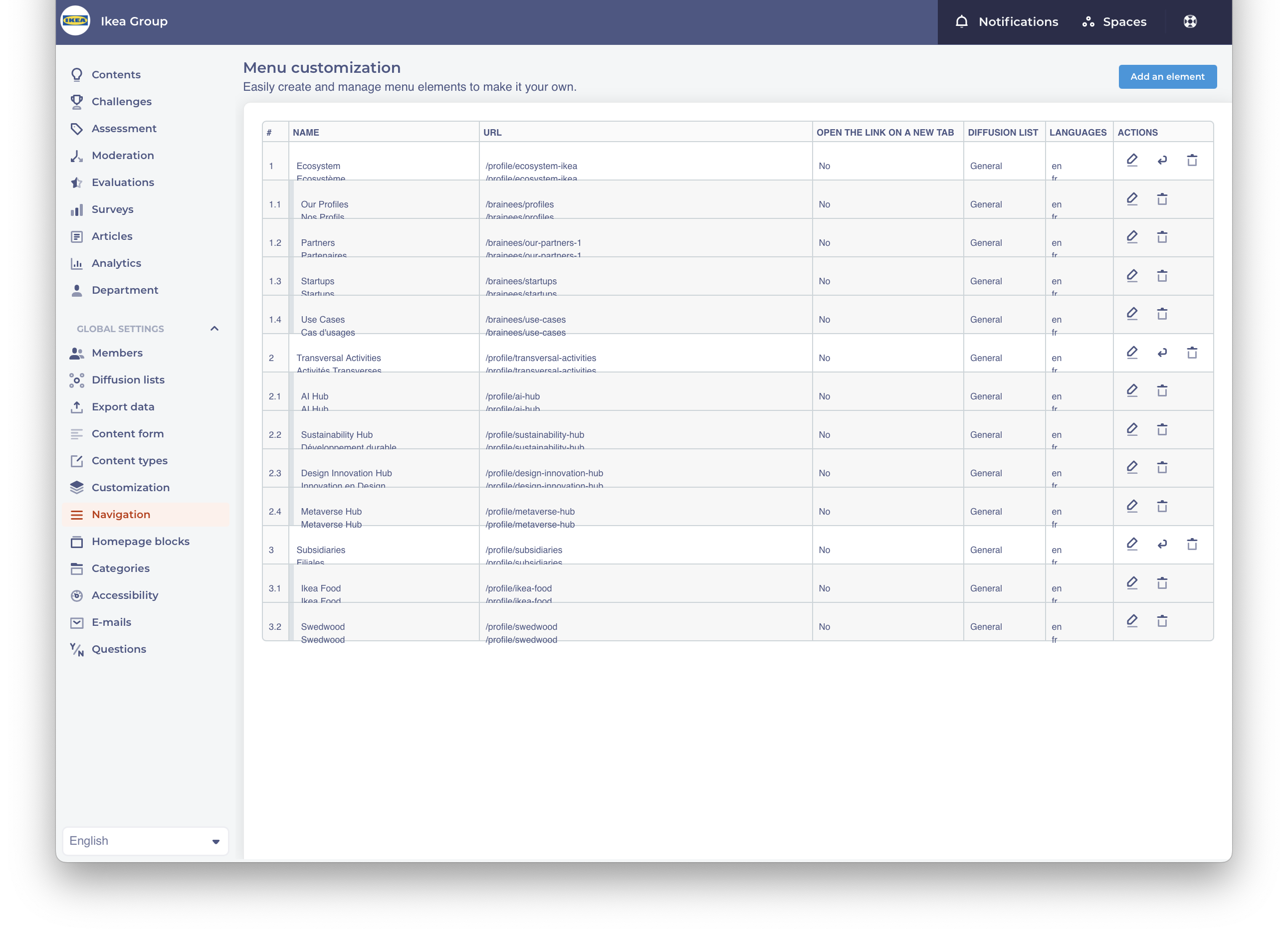 - Navigate to the Navigation Section: From your Dashboard, locate the "Navigation" section and click on the "add an element" button. A new window will appear.