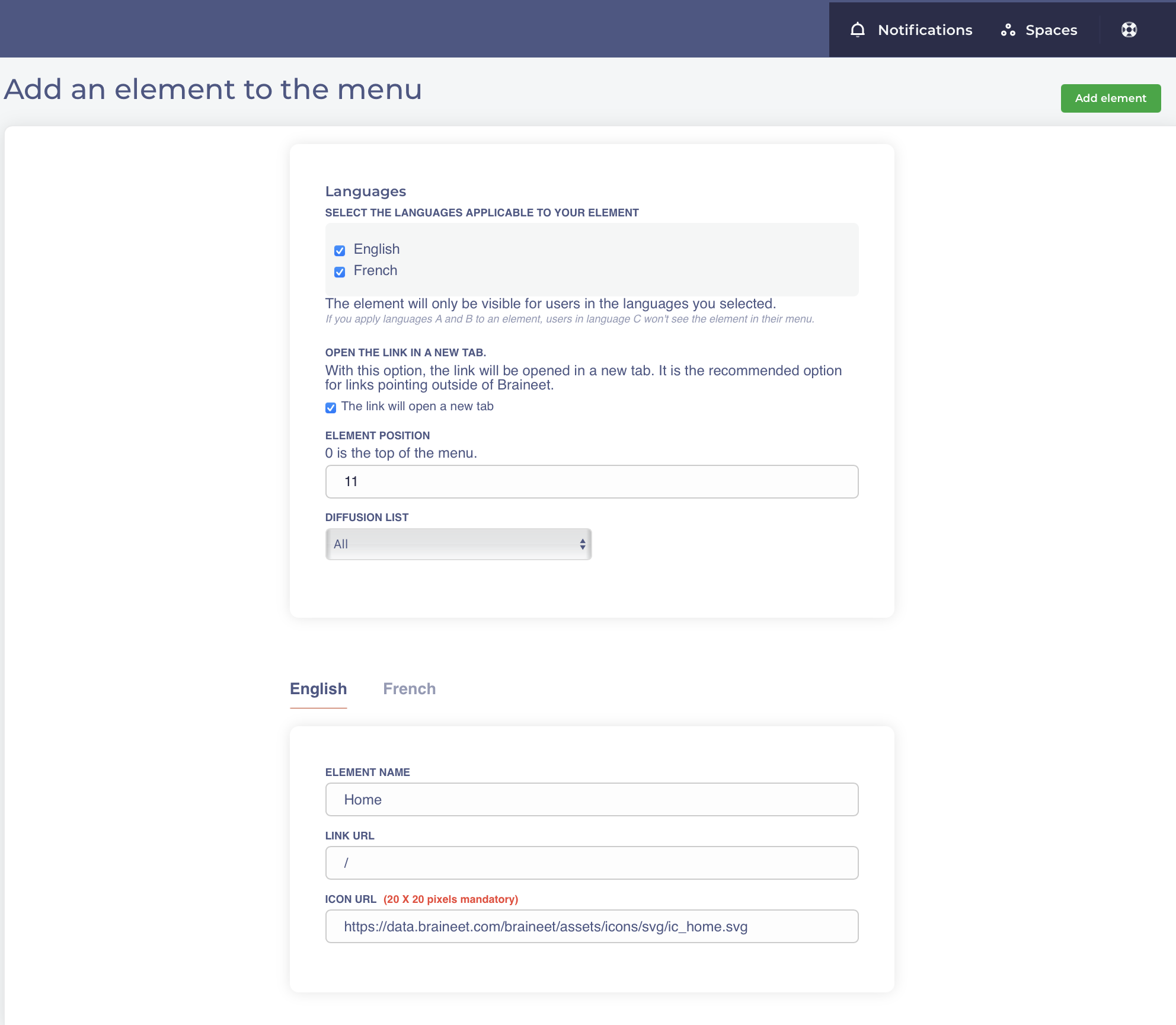 - Add the Element: Click on the "Add element" button to save your new menu item.