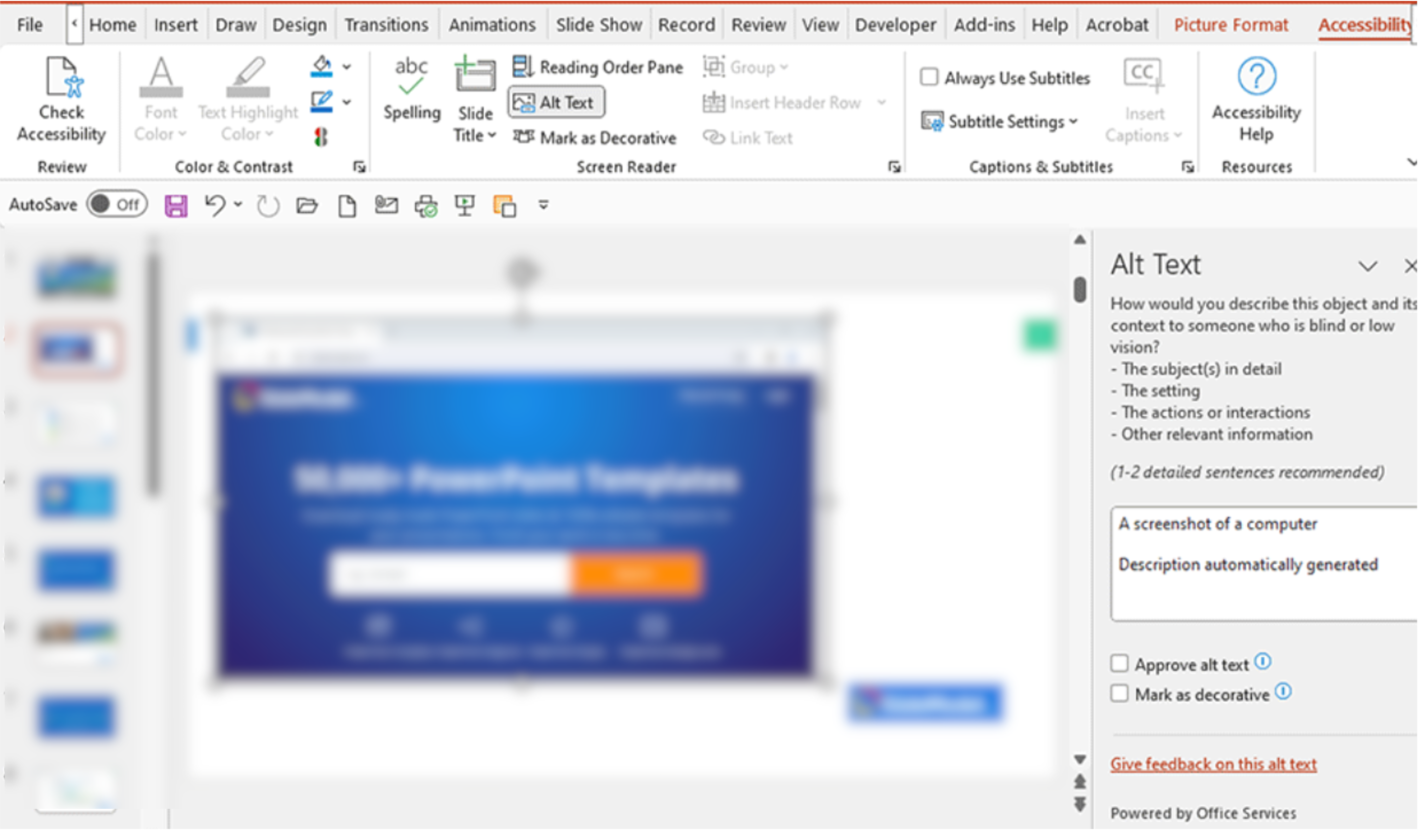 Then, in the menu, select Picture Format > Alt text. The tag is transferred to the Replacement Text block which appears on the right of the screen: