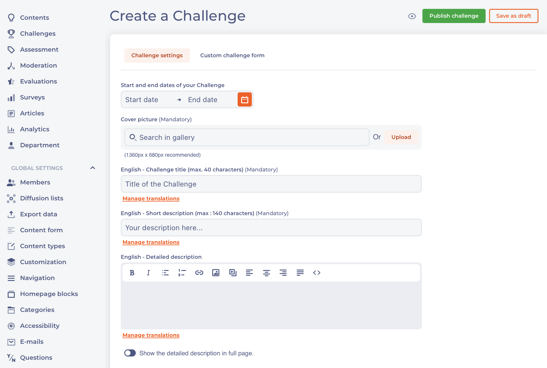 - Make the necessary changes to the challenge details, participation settings, or custom form.