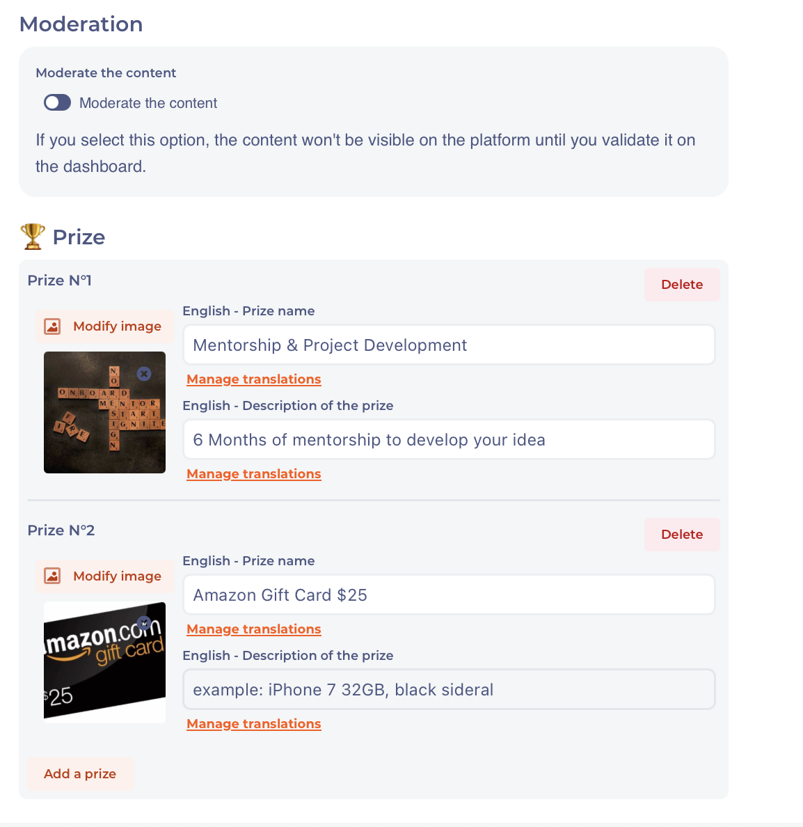 - Create Prizes: Add an unlimited number of prizes to reward the best ideas. For each prize, provide a title, description, and a small photo or illustration.