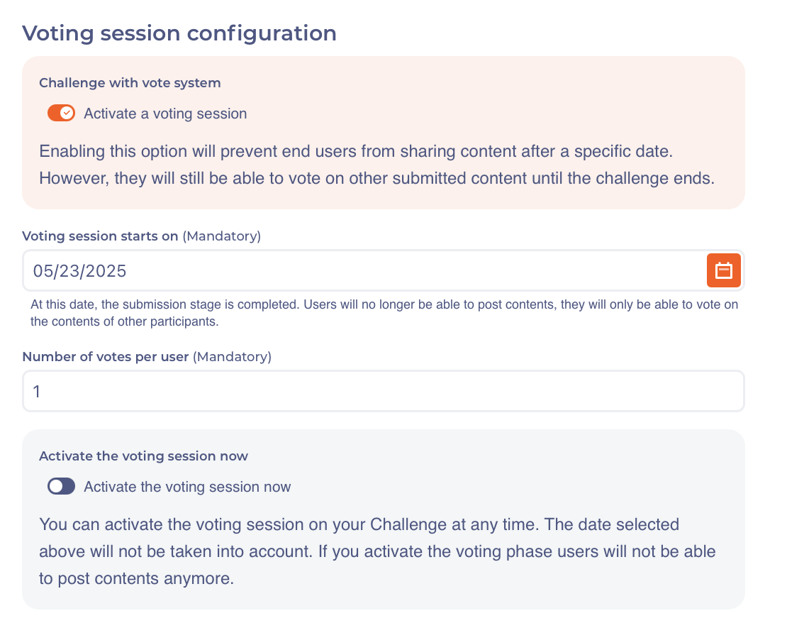 - Votes per User: Specify the number of votes each user can cast. Note that users cannot vote for their own submissions.